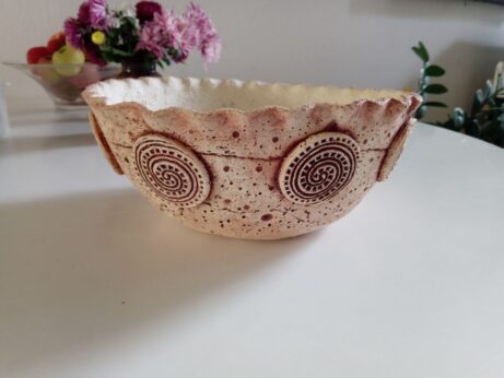 Keramický květináč s ornamenty tvaru misky o průměru asi 25 cm a výšky 15 cm. Vhodný na zahradu, balkon i do domu. Keramika je vyrobena ze světlé hlíny, ornamenty jsou zvýrazněny oxidem. Páleno na vysokou teplotu. Originální ručně vyrobená dekorativní keramika pálená na vysokou teplotu.